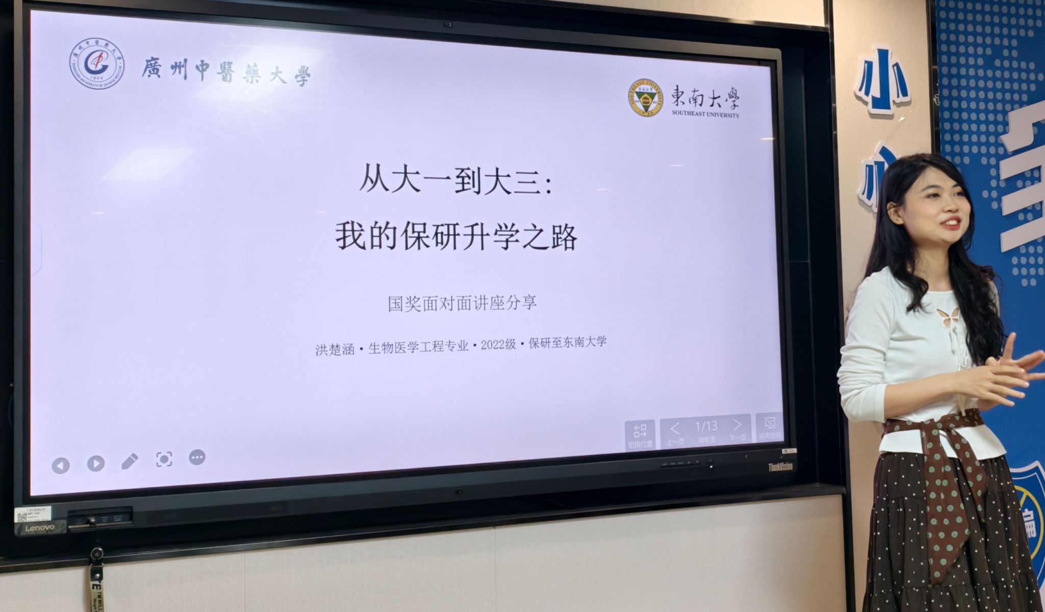 3月31日晚,医学信息工程学院在一站式学生社区举办“守时笃学・杏林正风”——“我与国奖获得者面对面”系列分享会第一期,特邀 2025年国家奖学金获得者、2022 级生物医学工程专业洪楚涵同学担任主讲嘉宾,为有保研意向的同学开展保研全流程经验分享。此次分享会旨在进一步加强学风建设,深入推进资助育人工作,充分发挥国家奖学金、国家励志奖学金获得者的榜样引领作用,营造奋发向上、励志成才的良好校园文化氛围。