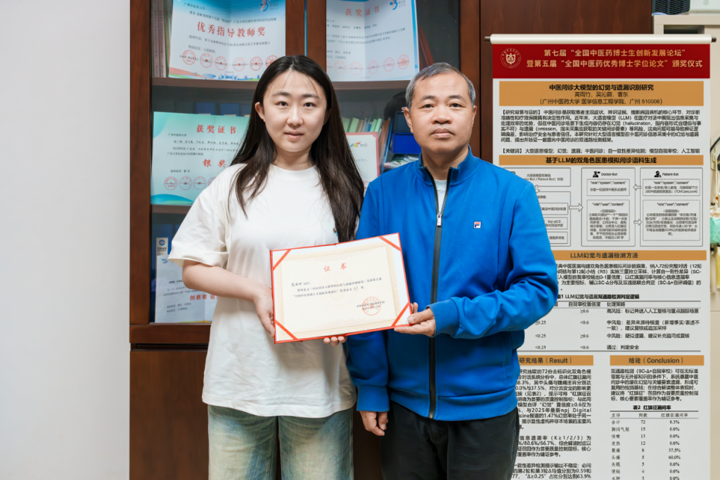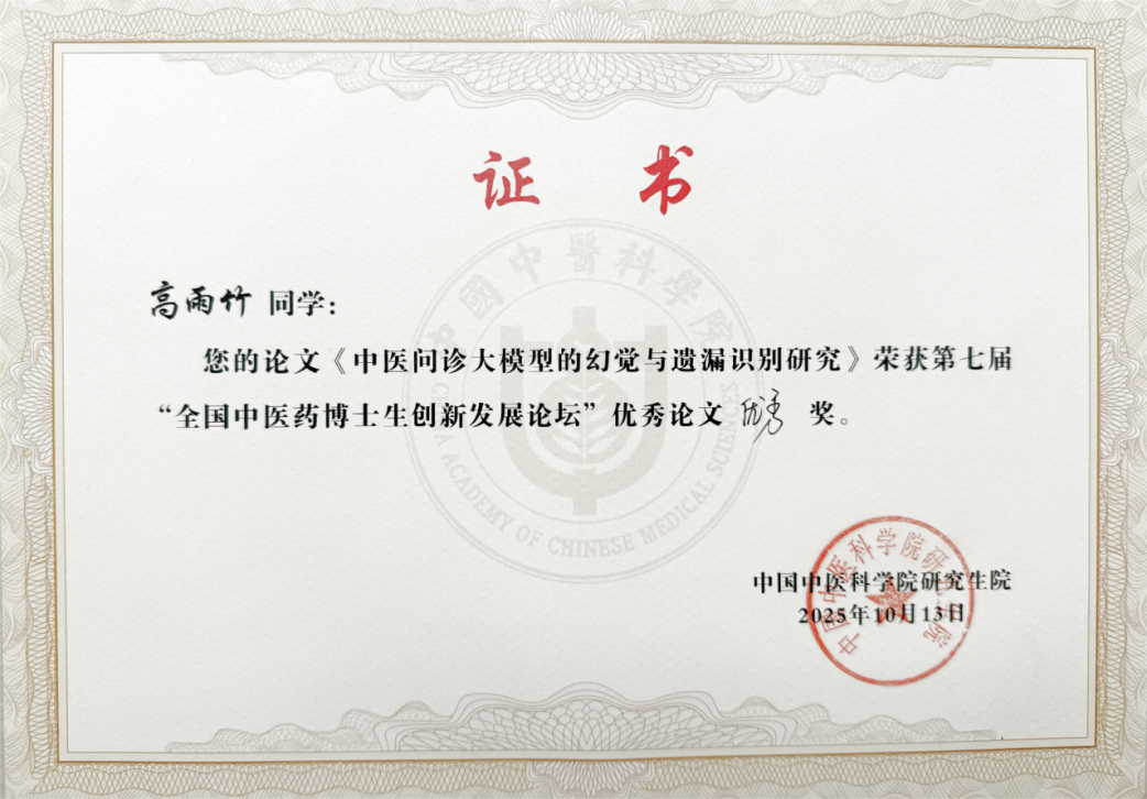 近日由中国中医科学院主办的第七届“全国中医药博士生创新发展论坛”在江苏苏州举行,同期开展第五届全国中医药优秀博士学位论文评选工作。广州中医药大学医学信息工程学院2024级博士研究生高雨竹(指导老师:曹东)的论文《中医问诊大模型的幻觉与遗漏识别研究》表现突出,荣获“优秀论文优秀奖”,充分展现了医工学院在中医药与信息工程交叉领域人才培养的实际成效。