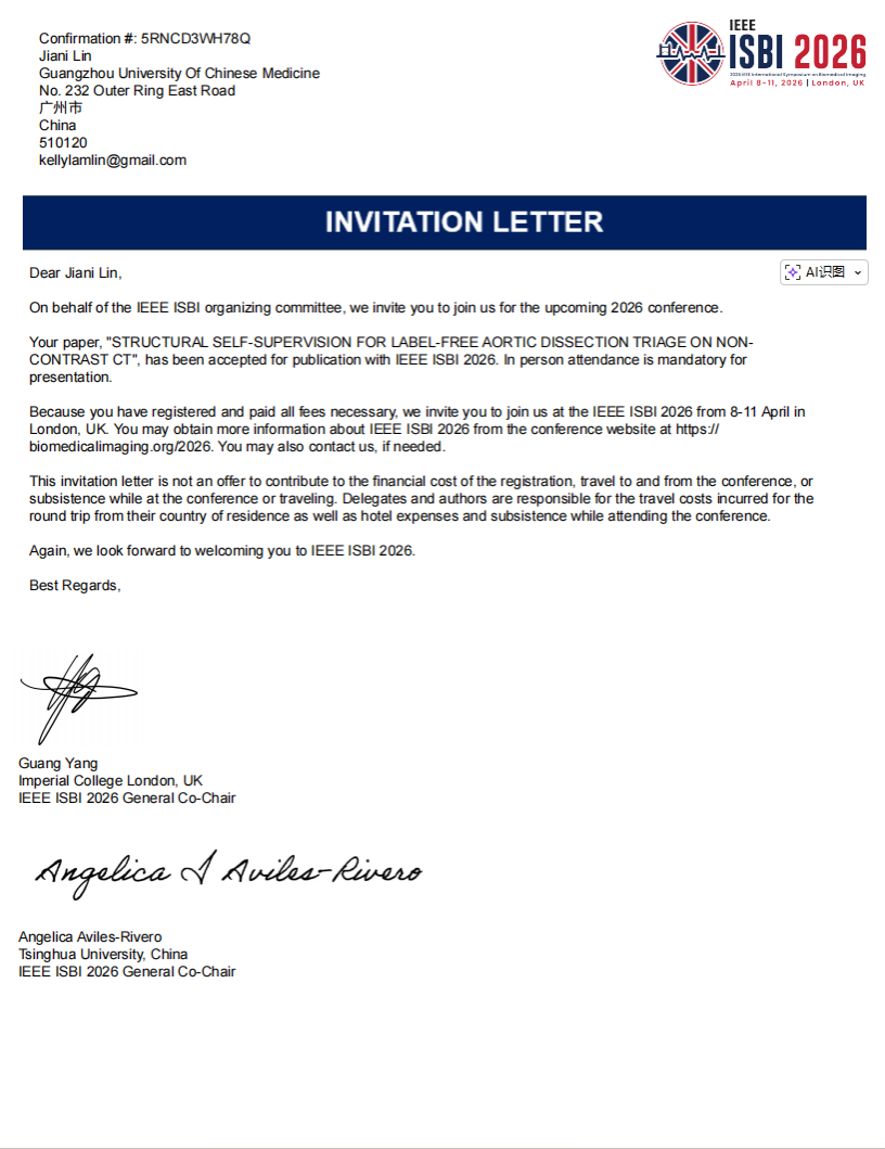 ISBI是由IEEE信号处理协会与IEEE生物医学工程协会联合主办的国际权威学术会议,专注于生物医学成像与医学影像的数学、算法及计算方法研究,是医学影像与生物医学工程领域的重要国际会议之一。录用论文将在IEEE会议论文集中正式发表并收录于IEEE Xplore数据库。林佳妮的研究利用人工智能技术,致力于解决非造影剂条件下主动脉夹层的早期诊断难题,获得三位国际评审专家一致认可,被认为具有较高的创新性与临床价值。